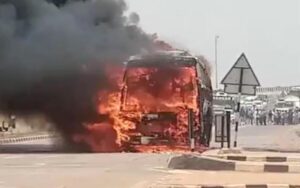 जिस बस में आगजनी हुई है वह महेंद्रा ट्रेवल्स की है। बस में करीब 40 यात्री सवार थे, सभी सुरक्षित हैं। जिस बस में आगजनी हुई है वह महेंद्रा ट्रेवल्स की बताई जा रही है. बस में करीब 40 यात्री सवार थे।