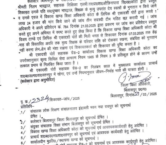 दरअसल कोटा विकासखण्ड की शिक्षिका श्रीमती नीलम भारद्वाज ने पखवाड़े भर पहले कलेक्टर द्वारा आयोजित कर्मचारी जनदर्शन में एक शिकायत पत्र सौंपा। उन्होंने बताया कि उनके शिक्षक पति के देहावसान उपरांत उनके स्वत्वों के भुगतान के लिए 1.24 लाख रूपये का रिश्वत मांगा जा रहा है। बीईओ को जानकारी देने के बाद उनके द्वारा भी कोई सुनवाई नहीं की जा रही है। कलेक्टर ने मामले को गंभीरता से लेते हुए उनके शिकायत को टीएल पंजी में दर्ज किया और जिला शिक्षा अधिकारी को मामले की जांच के निर्देश दिए। जांच में महिला द्वारा लगाया गया आरोप सही पाया गया। बीईओ श्री विजय पाण्डे एवं लिपिक एकादशी पोर्ते ने मिलकर महिला शिक्षिक को परेशान किया। बिना रिश्वत लिए उनके वास्तविक स्वत्वों को भुगतान नहीं किया जा रहा था। जान बूझकर विलंबित एवं परेशान किया जा रहा था। जांच टीम की रिपोर्ट के आधार पर बीईओ विजय टाण्डेय को हटा दिया गया है। उनके विरूद्ध विभागीय जांच के आदेश दे दिए गए हैं। तब तक के लिए उन्हे खुरदूर कोटा में प्राचार्य पद पर कार्य करने के लिए निर्देशित किया गया हैं। वहीं सहायक वर्ग 2 श्री एकादशी पोर्ते को निलंबित कर दिया गया है। निलंबन काल में श्री पोर्ते को रतनपुर हायर सेकेण्डरी स्कूल में मुख्यालय नियत किया गया है। नियमानुसार उन्हें जीवन निर्वाह भत्ता दी जायेगी।