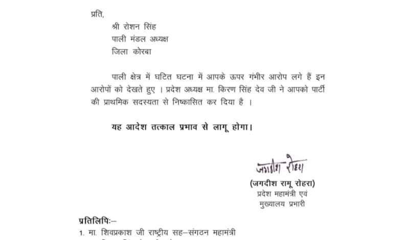 प्रदेश अध्यक्ष किरण सिंह देव ने इस घटना को गंभीरता से लेते हुए शनिवार रात ही हत्या के आरोप में गिरफ्तार दोनों नेताओं पर कार्रवाई की और उन्हें तत्काल प्रभाव से पार्टी से बाहर कर दिया। इस फैसले के बाद पार्टी ने स्पष्ट संदेश दिया है कि कानून व्यवस्था और अनुशासन से समझौता नहीं किया जाएगा।